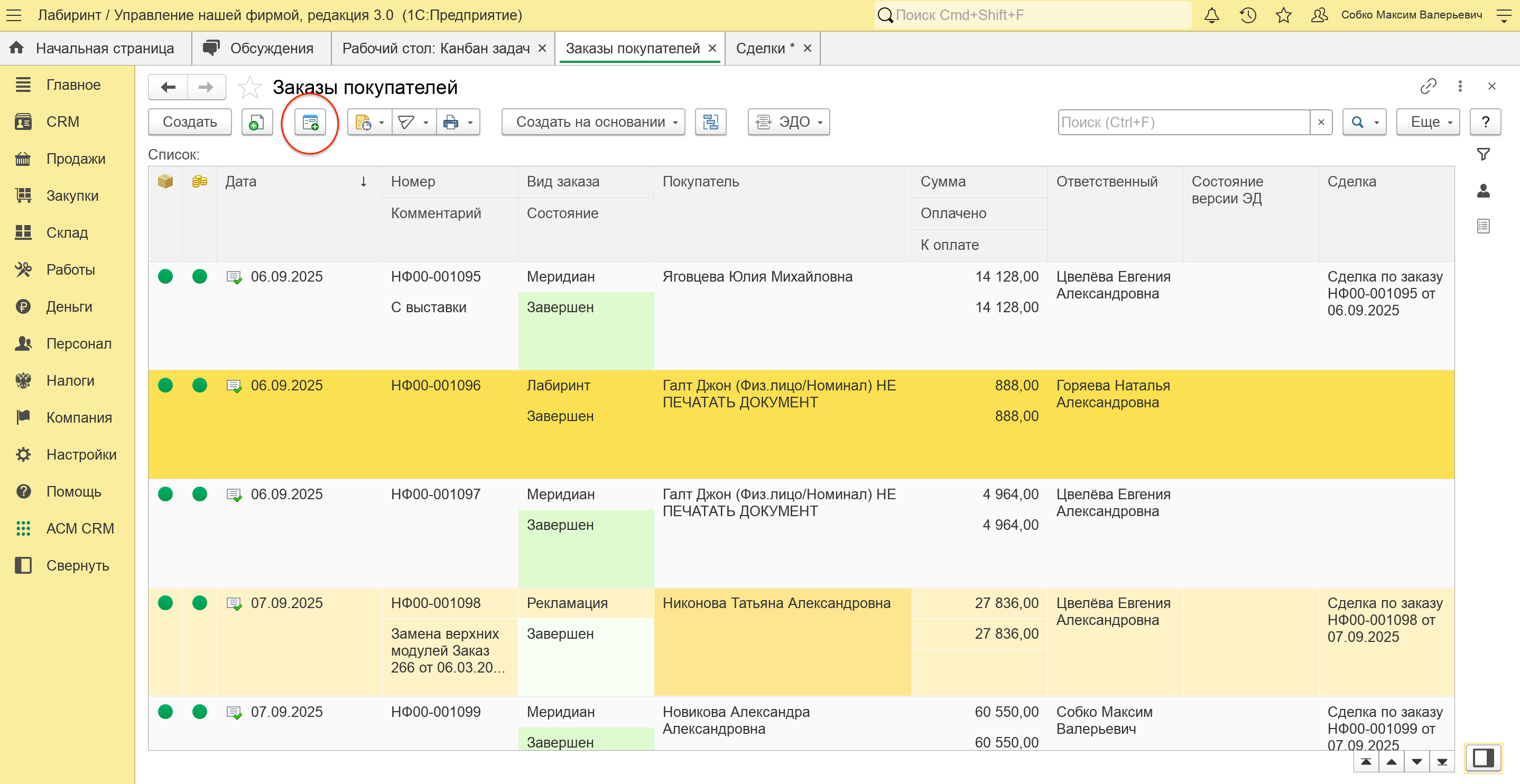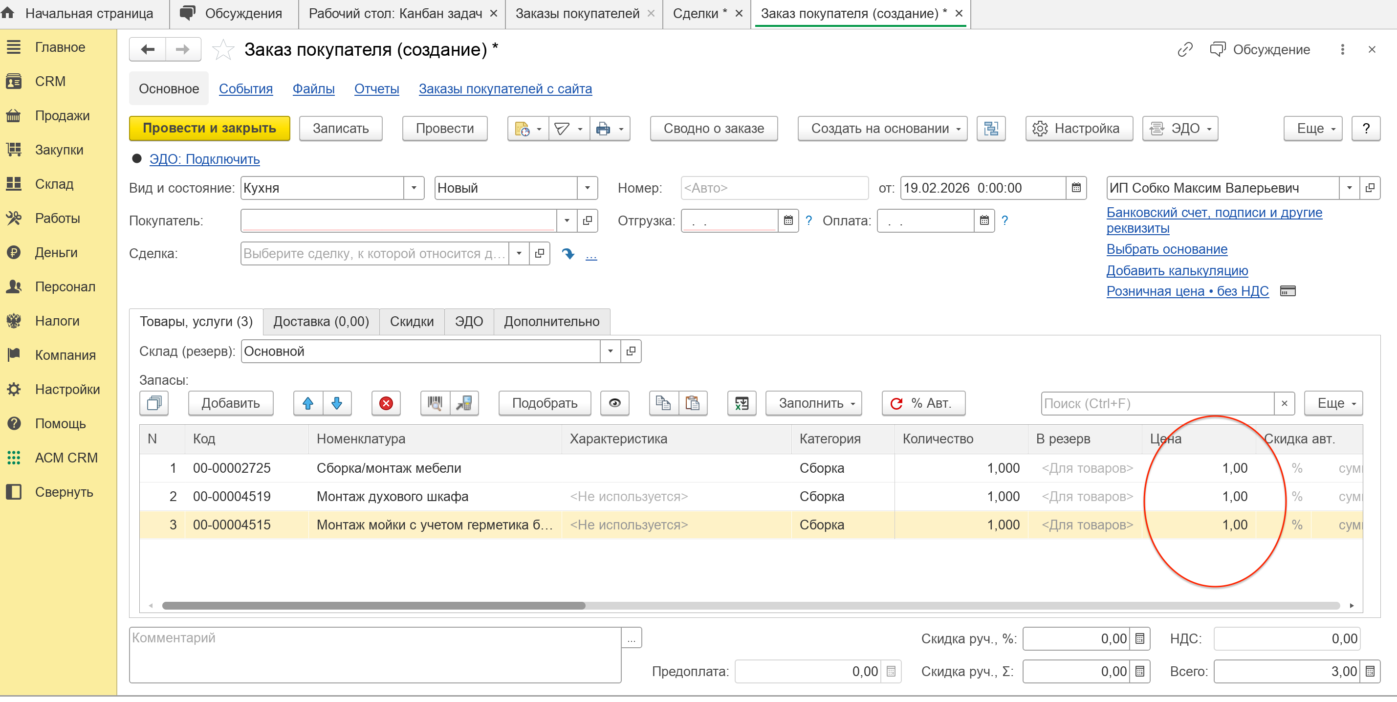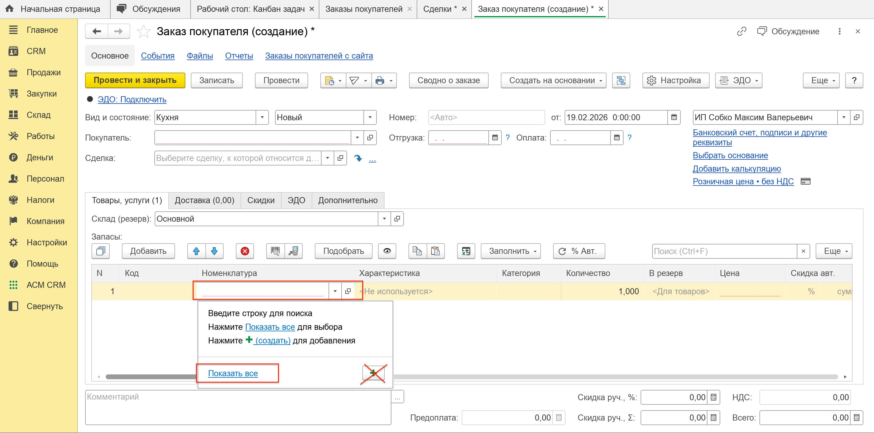 Далее заполняем товары и услуги, а также ФИО Покупателя и прочие данные как в других заказах