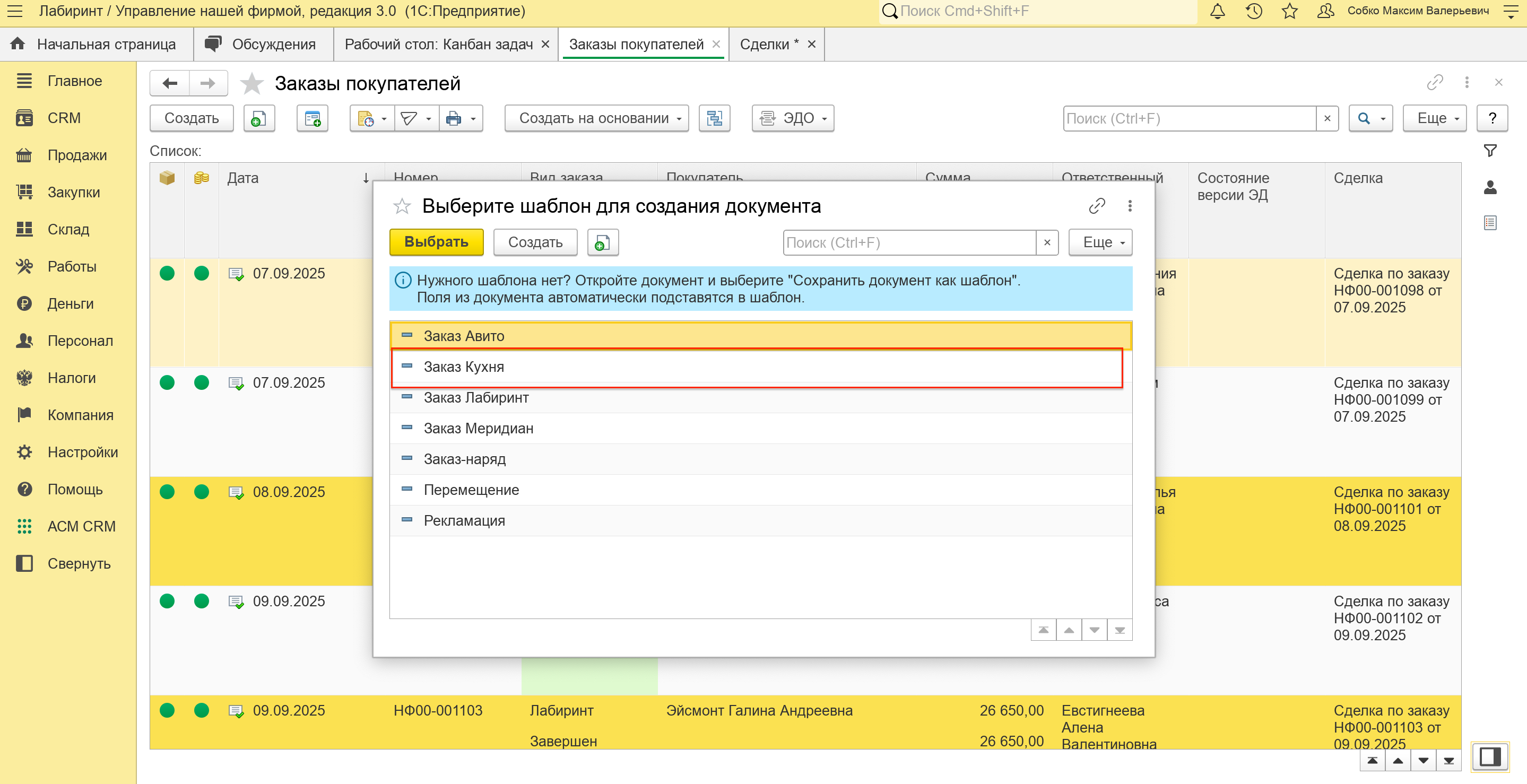 Выбираем Заказ Кухня. Шаблон нужен для выбора нужного вида заказа