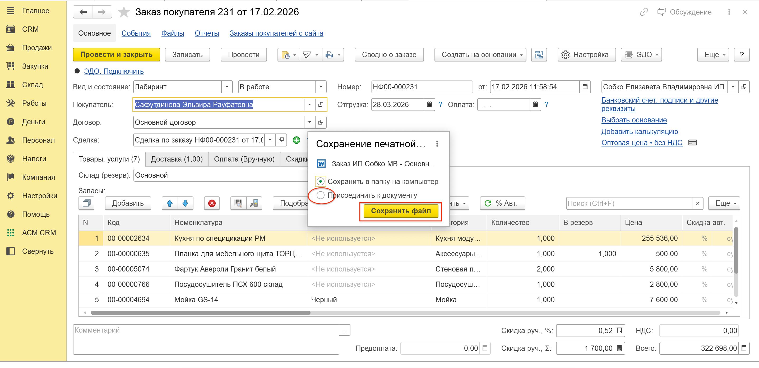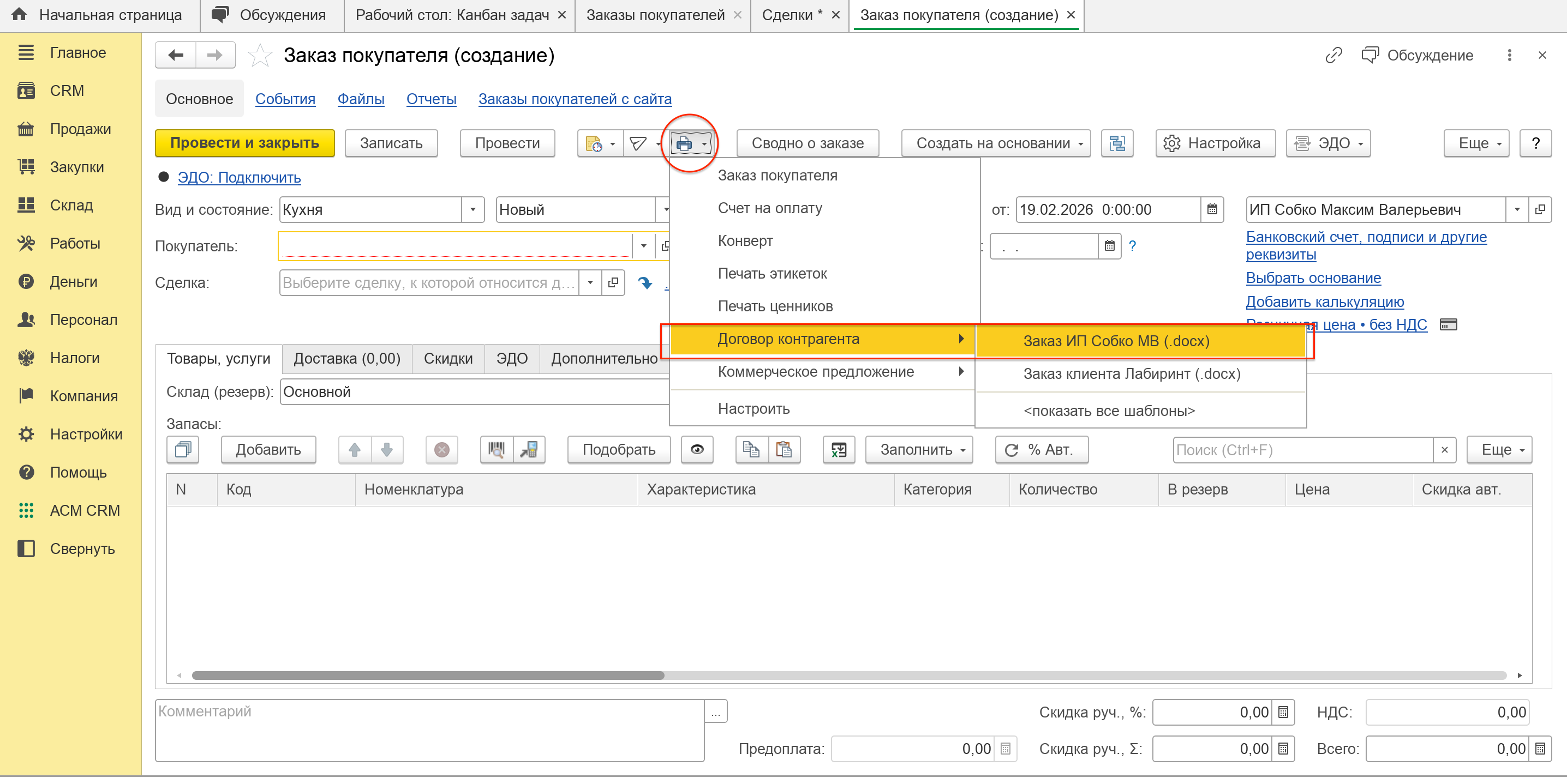 После заполнения таблицы товаров и услуг выводим заказ на печать для Клиента. Обратите внимание что именно печатаем - Заказ ИП Собко МВ!