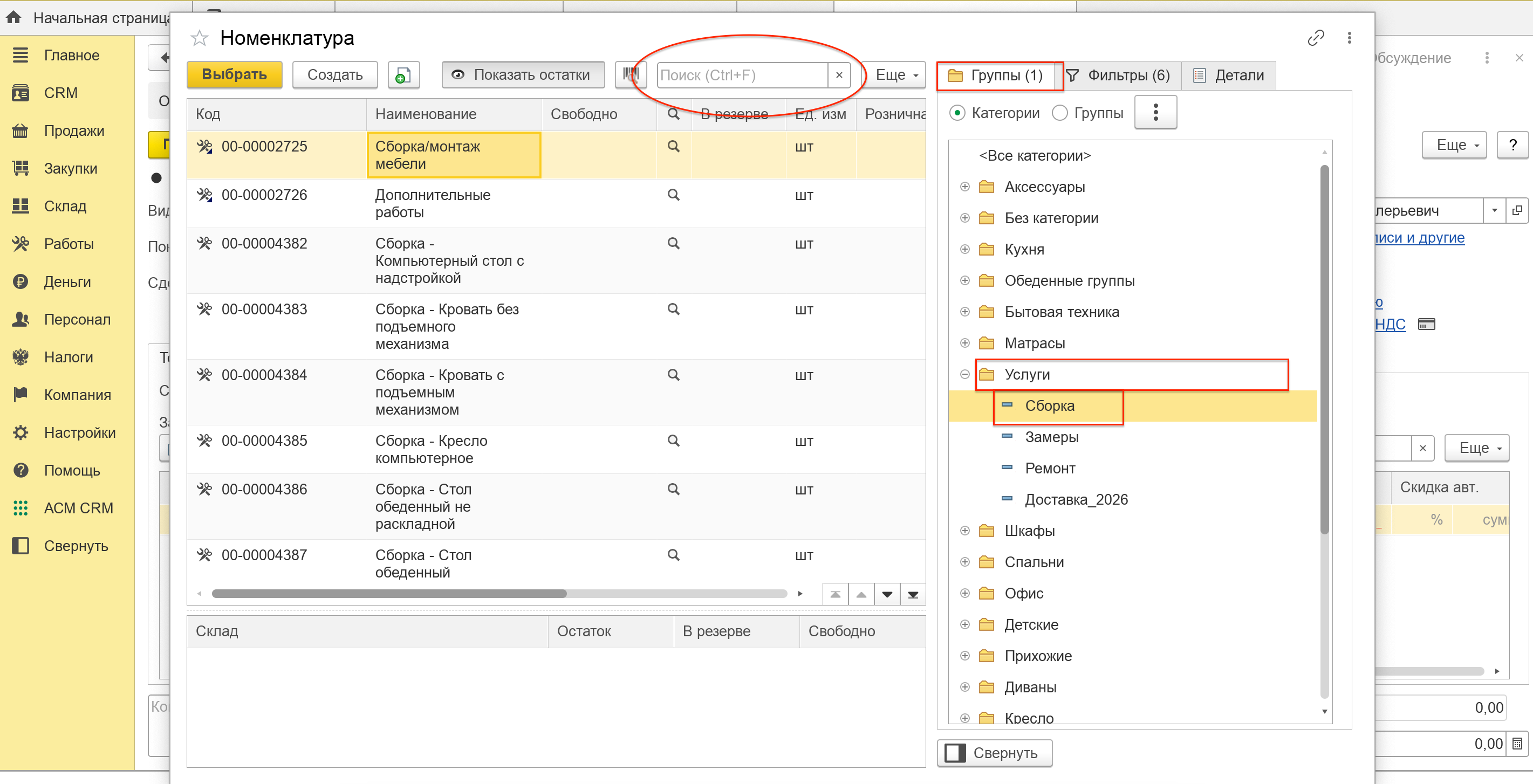 В данном виде заказа нужно будет вписывать не только товары, но и услуги по сборке. Чтобы их удобнее было искать из заказа откройте окно номенклатуры и сделайте отбор (фильтрацию) как на скрине. Далее по ключевым словам найдите в поиске нужную услугу (пример: монтаж духового шкафа можно найти по первым буквам “дух…”)