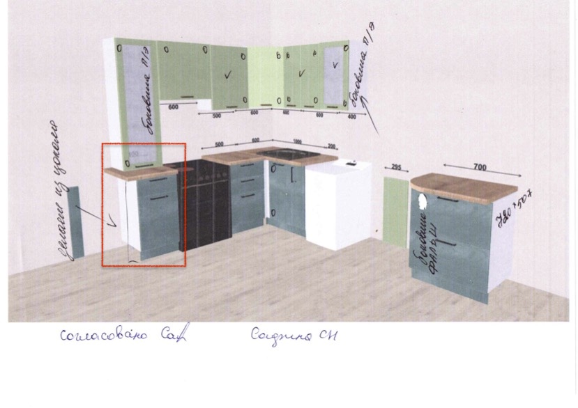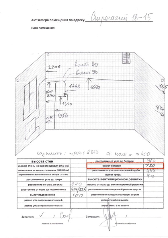 складываем размеры нижних модулей начиная от мойки: 600+500+600+400 = 2100, четко влезаем в размер 2206 по фронтальной (основной) стене, а нет! батарея откусывает 120 мм, и тогда получается 2206 - 120 = 2086