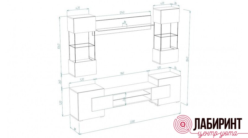 Ниша под ТВ: 1160 мм при размещении ТВ на тумбе.