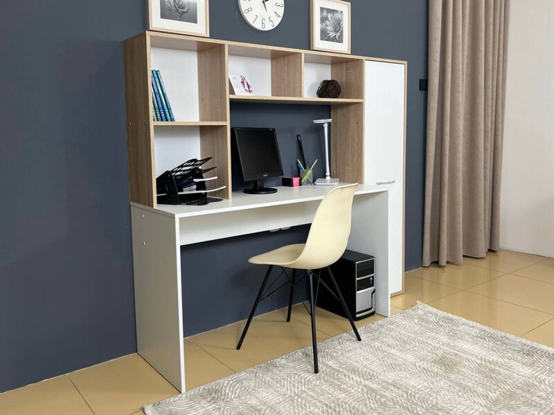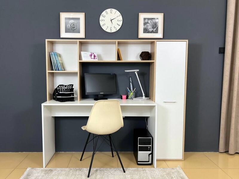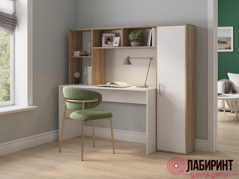 Компактное и вместительное рабочее место. Полки и шкаф для хранения. Можно дополнить комодом и стеллажом.