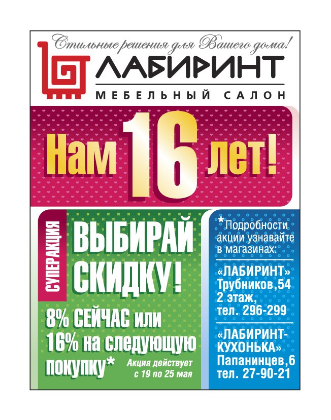 Отличная новость! Мебельному салону "Лабиринт" 16 лет! В честь этого события мы проводим СУПЕР-АКЦИЮ: вы можете выбрать либо получить скидку 8% сразу при оформлении покупки, либо получить от нас подарочный сертификат на сумму 16% от совершаемой вами покупки, который вы можете использовать сразу либо в течении 2 месяцев после оформления! Акция действует с 19 по 25 мая. Скидка по акции не суммируется со скидками по дисконтным картам, подарочным и скидочным сертификатам.