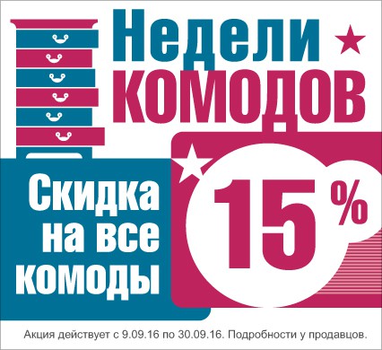 С 09.09.2016г. по 30.09.2016г. в нашем магазине Недели КОМОДОВ! Скидка на все комоды в наличии и под заказ 15%! Скидка предоставляется при осуществлении покупки или оформлении заказа в розничном магазине "Лабиринт", расположенном по адресу: г.Первоуральск, ул.Трубников, д.54, 2 этаж. Скидка не суммируется с другими акционными предложениями магазина и со скидками по дисконтным картам. Приходите к нам за покупками!