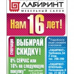 Нашему магазину в мае этого года исполняется 16 лет. В честь этого события мы проводим суперакцию: выбирайте скидку 8% прямо сейчас или 16% на следующую покупку. Акция проводится с 19 по 25 мая!