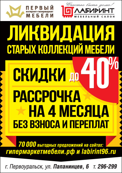 В НОВЫЙ ГОД С НОВЫМИ КОЛЛЕКЦИЯМИ МЕБЕЛИ! ИЗБАВЛЯЕМСЯ ОТ СТАРЫХ! СКИДКИ ДО 40%! Самое время купить новый шкаф или диван! Только до 31 января 2018года. Ассортимент распродажных товаров вы можете посмотреть на нашем сайте, а также на сайте гипермаркетмебели.рф . Мы ждем Вас в салоне по адресу: г.Первоуральск, ул.Папанинцев, д.6. Искренне Ваш, Лабиринт.