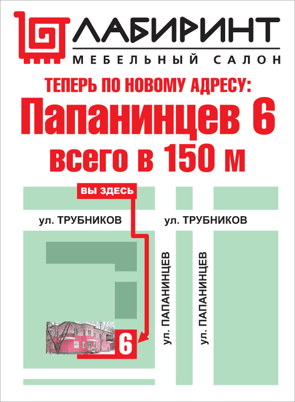 Наш розничный мебельный салон "Лабиринт" переехал на собственные торговые площади. Наш новый адрес: г.Первоуральск, ул.Папанинцев, д.6. В честь переезда мы объявляем акцию: 2 месяца до 19.01.2016г. цены в нашем магазине снижены до уровня интернет-цен, т.е. в среднем на 15-20%. Спешите делать выгодные покупки!