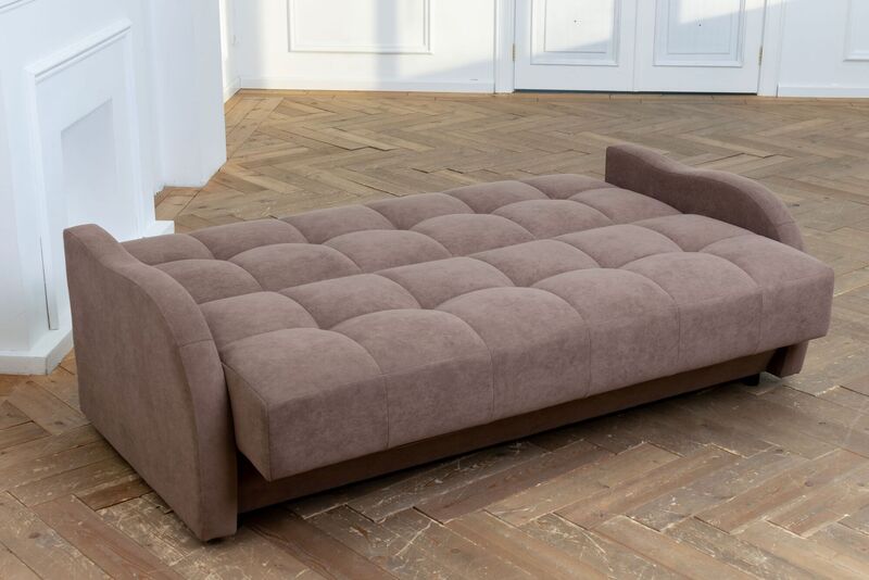Выпуклые формы спинки и посадочного места создают необыкновенную мягкость модели. В наполнении - холлофайбер. Он был создан на основе структуры синтепона, но заметно отличается от предшественника. У синтепона волокна прямые, у холлофайбера — витые. Отсюда и главное достоинство материала — способность легко изменять и восстанавливать форму. На диване комфортно не только сидеть, но и спать. Выпуклые формы под тяжестью тела с легкостью превращаются в абсолютно ровное спальное место.