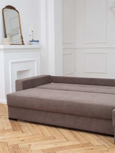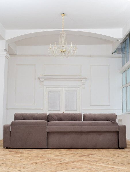 При раскладке дивана получается полноценная двуспальная кровать с ортопедическим матрасом. Габариты сп. места: 1600х2000. В наполнении – независимый пружинный блок, гипоаллергенный струттофайбер, кокосовое волокно, синтепух (аналог лебяжьего пуха).