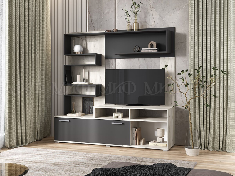Стенка "Рица" Воплощает в себе элегантность и функциональность. Красивая и асимметричная, она выглядит весьма эффектно. Основное предназначение – установка видео-аудио техники. Для современной гостиной в классическом стиле.