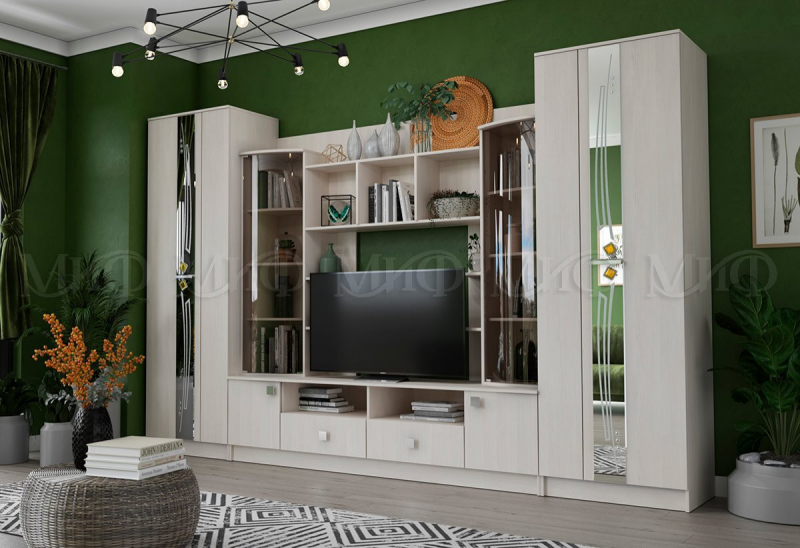Стенка "Венеция" ЛДСП Шикарная современная модульная система с продуманным до тонкостей дизайном – для формирования уникального интерьера гостиной зоны. В оформлении использован пескоструйный рисунок на зеркалах и дверцы с тонированными стеклами.