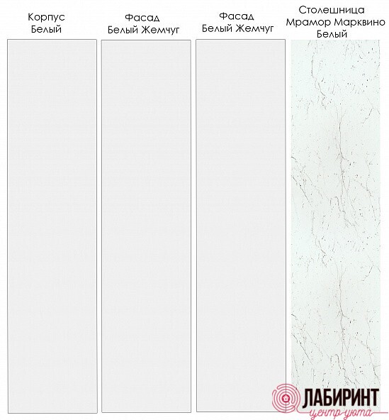 - Нижние модули: цвет корпуса:Белый; фасады:Жемчуг, столешница: Мрамор Марквина белый