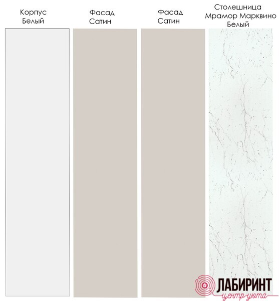 - Нижние модули: цвет корпуса:Белый; фасады: Сатин, столешница: Мрамор Марквина белый