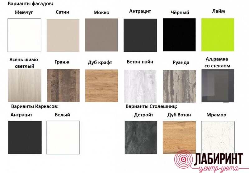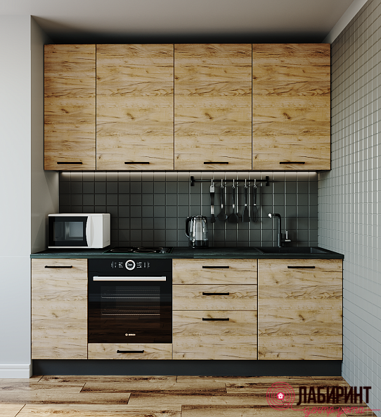 - Нижние модули: цвет корпуса:Антрацит; фасады: Дуб Крафт, столешница: Детройт