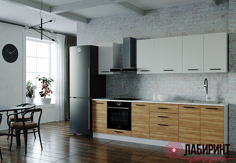 - Нижние модули: цвет корпуса: Белый; фасады: Дуб Крафт, столешница: Мрамор Марквина белый