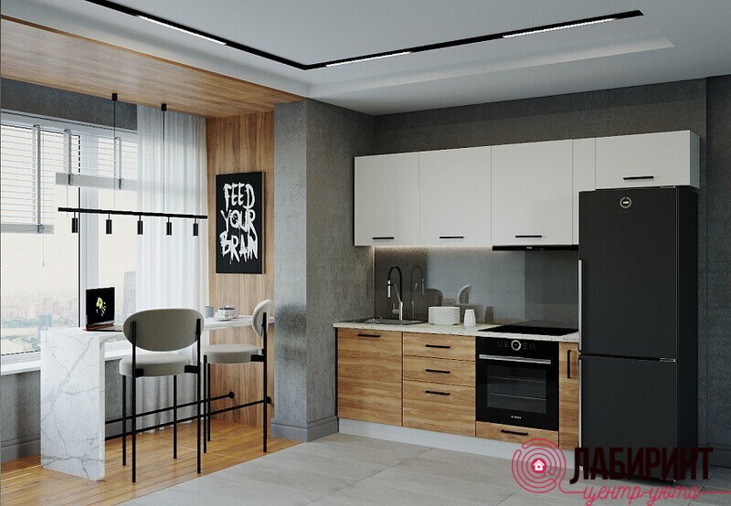 - Нижние модули: цвет корпуса:Белый; фасады: Дуб Крафт, столешница: Мрамор Марквина белый