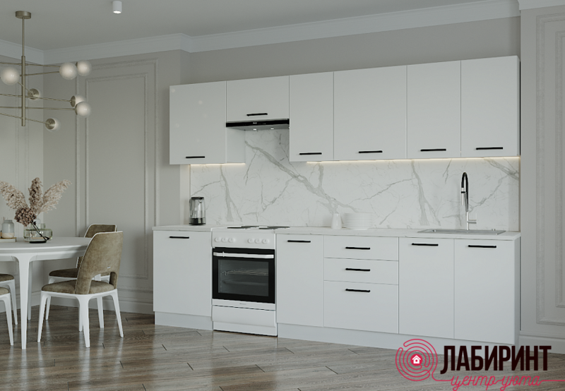 - Нижние модули: цвет корпуса:Белый; фасады: Жемчуг, столешница: Мрамор Марквина белый