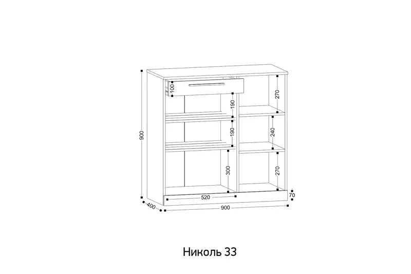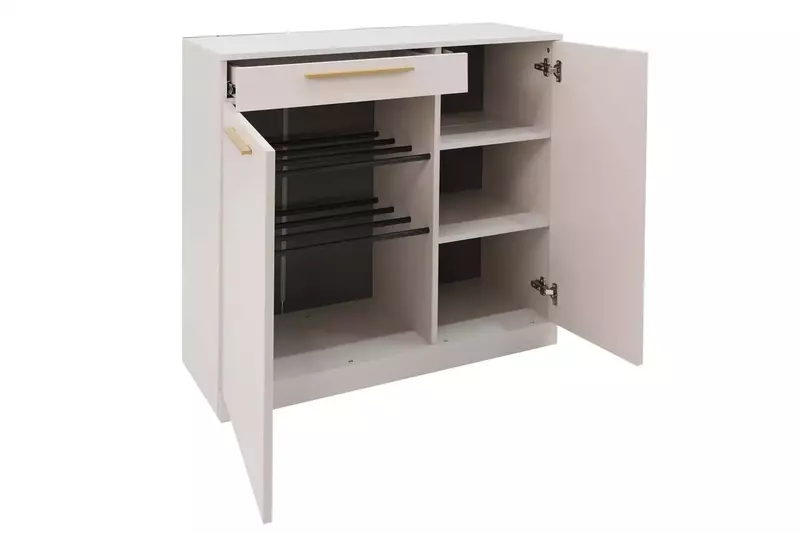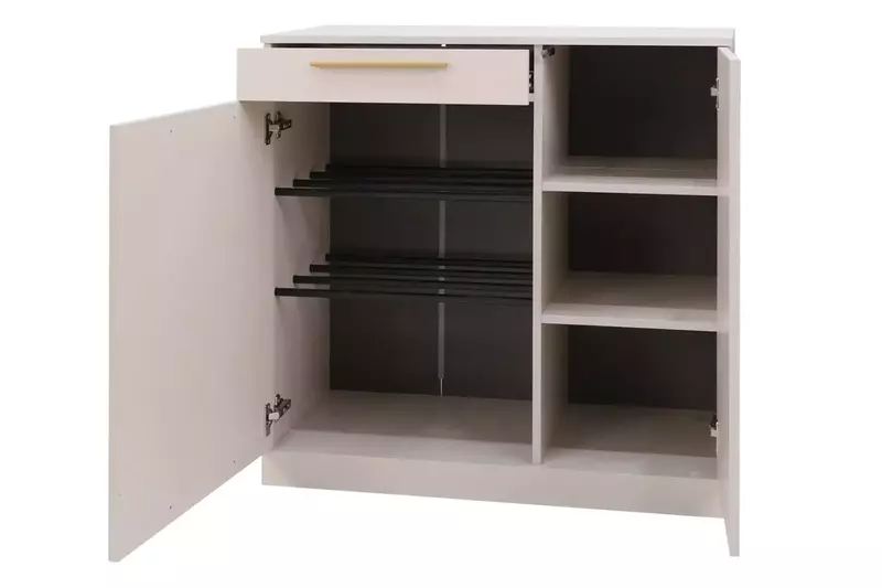 Тумба для обуви идеальна и как отдельный элемент прихожей, так и в комплекте модулей коллекции "Николь". Тумба оснащена двумя металлическими полками для хранения обуви, выдвижным ящиком и тремя полочки для хранения.