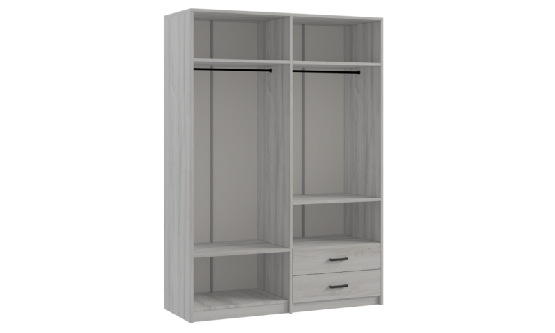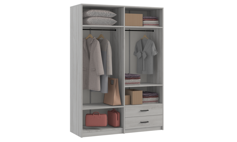 Имеет два отделения под одежду с антресольными полками и штангами под одежду