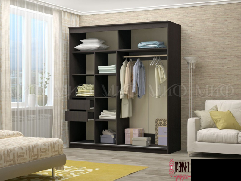 Шкаф-купе "Элегант №5" Строгая форма и отточенная симметрия, прочная конструкция и высокая функциональность. Простой, практичный и функциональный вариант для длительного и комфортного использования. Наполнение шкафа: слева два отдела полок и справа штанга.